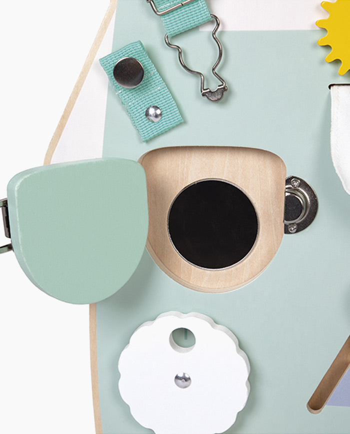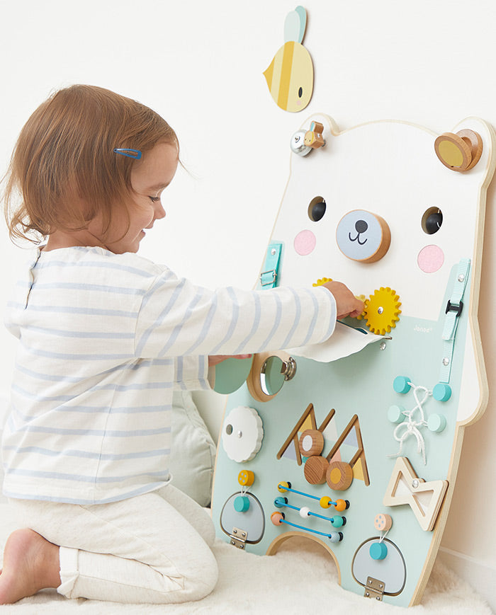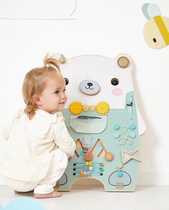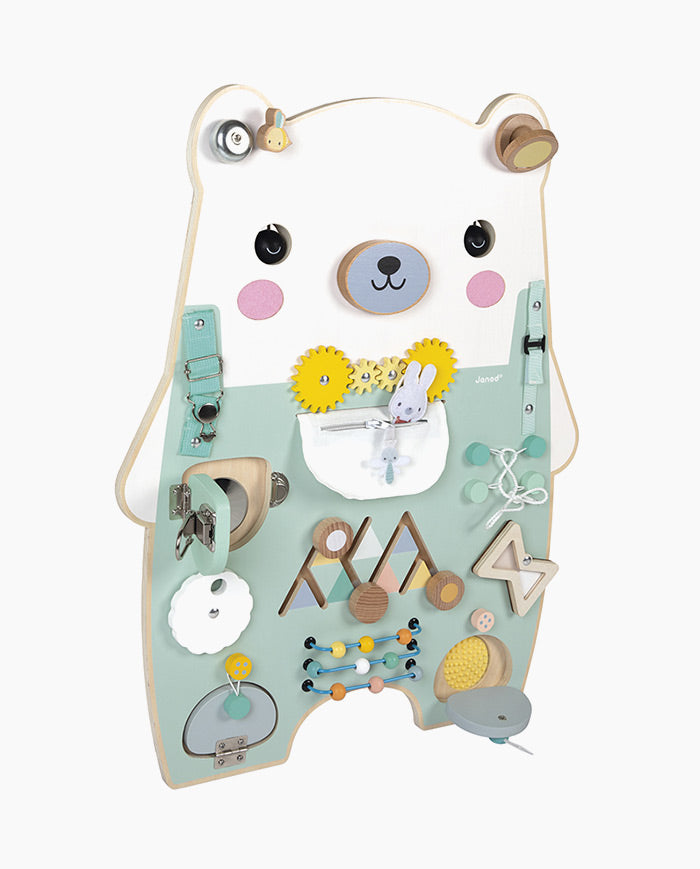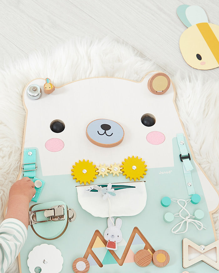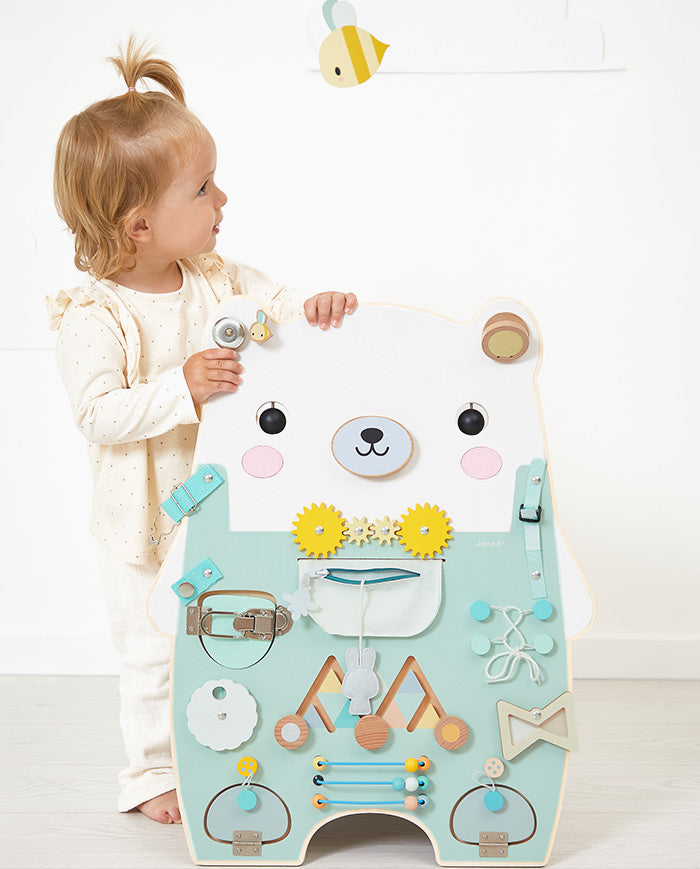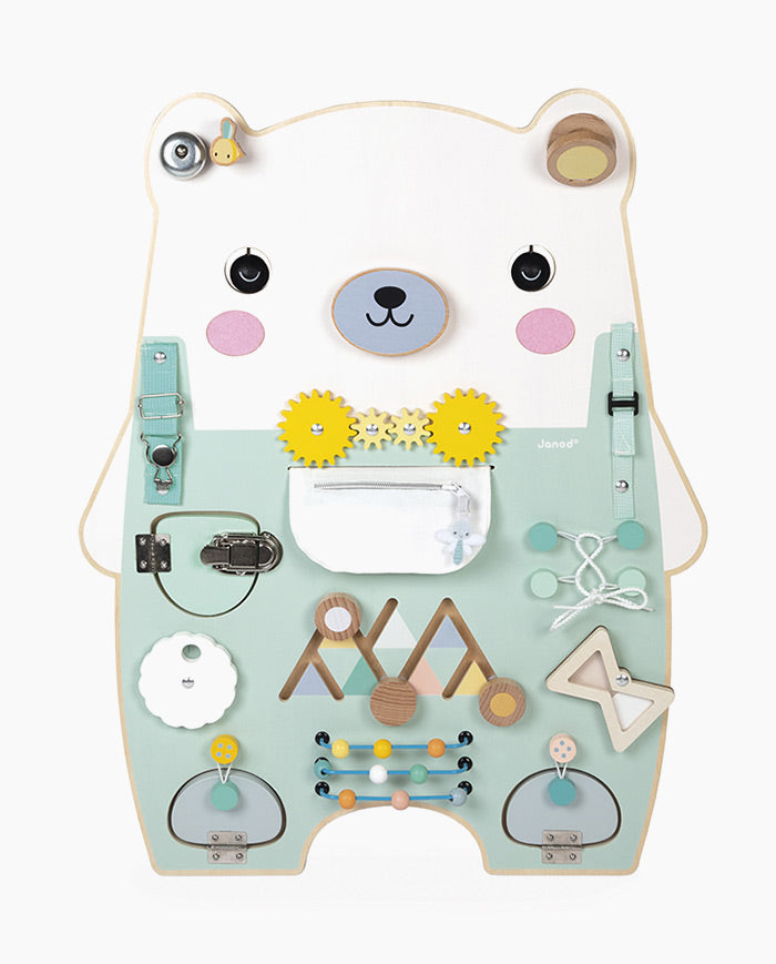 Panoul cu activitati sub forma de ursulet, din colectia Janod Pure, este ideal pentru a-i distra si stimula pe cei mici, avand peste 20 de jocuri de invatare timpurie. Astfel, panoul ursulet, din lemn certificat FSC, incurajeaza dezvoltarea abilitatilor motorii si motricitatii copiilor cu varste incepand de la 18 luni.