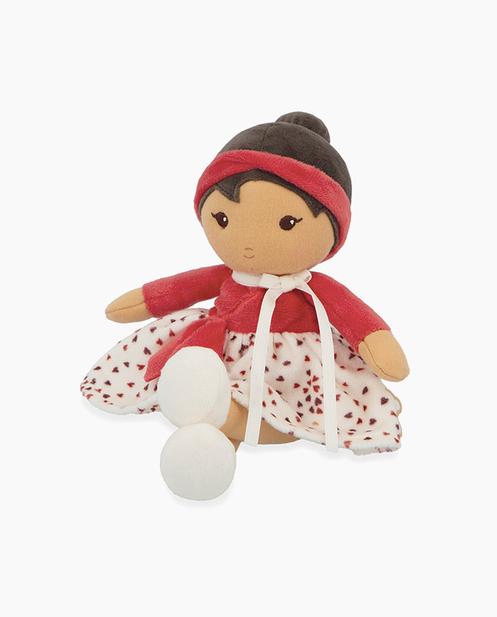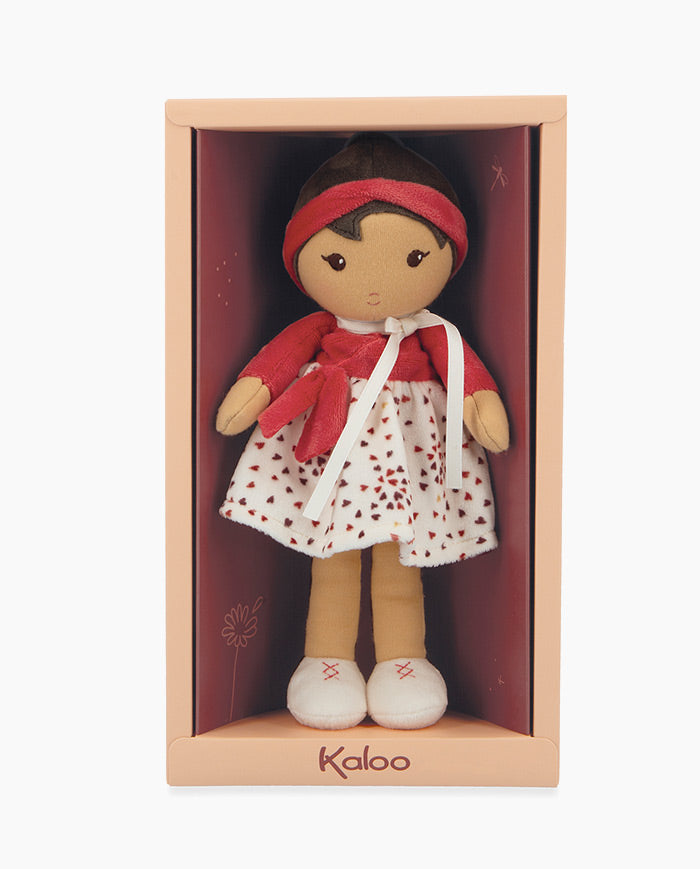 Papusa Emilie este realizata din material textil si poarta o frumoasa fusta cu volane, decorata cu inimioare, reflectand bucuria ei de a trai si dragostea pentru viata. Cu adorabila ei panglica rosie in forma de inima, asortata cu bentita, jucaria Kaloo este pregatita pentru orice aventura.